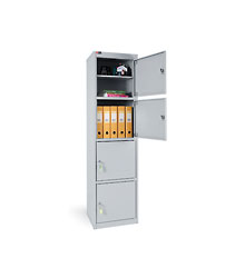 Модели КД-111 - КД-114 изготавливаются в двух вариантах: в разборном с замком "Cam Lock" и в сварном с усиленным замком "Блок". Каждая ячейка оснащена своим замком и рассчитана на вертикальную установку папок типа "Корона". По желанию Покупателя шкаф может комплектоваться съемной полкой (1 полка на ячейку). Также можно установить опечатывающее устройство.